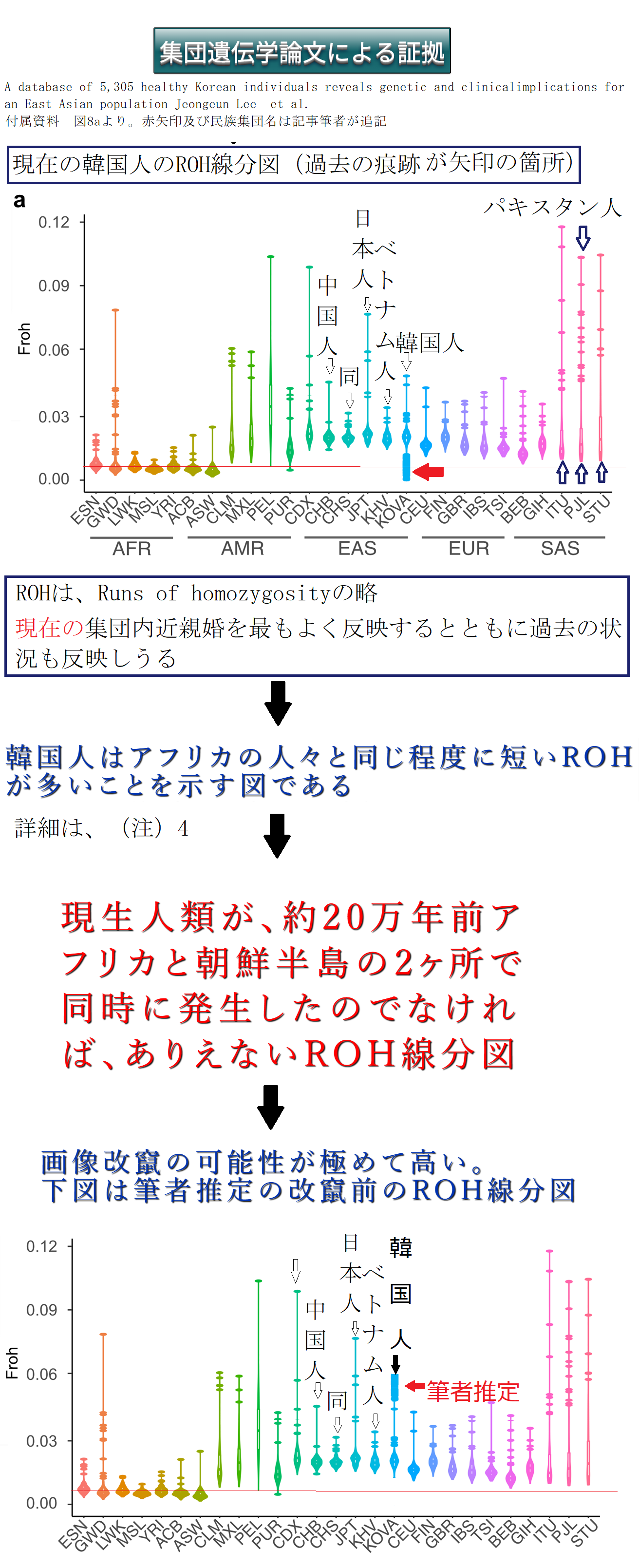 韓国人3名以上のサンプル数で初めて出された上記全ゲノムシーケンス論文では、韓国人の非同義一塩基変異が他の民族集団 に比べ、著しく高い頻度を示している旨を本文中で明言しており、論文@と完全に合致する。