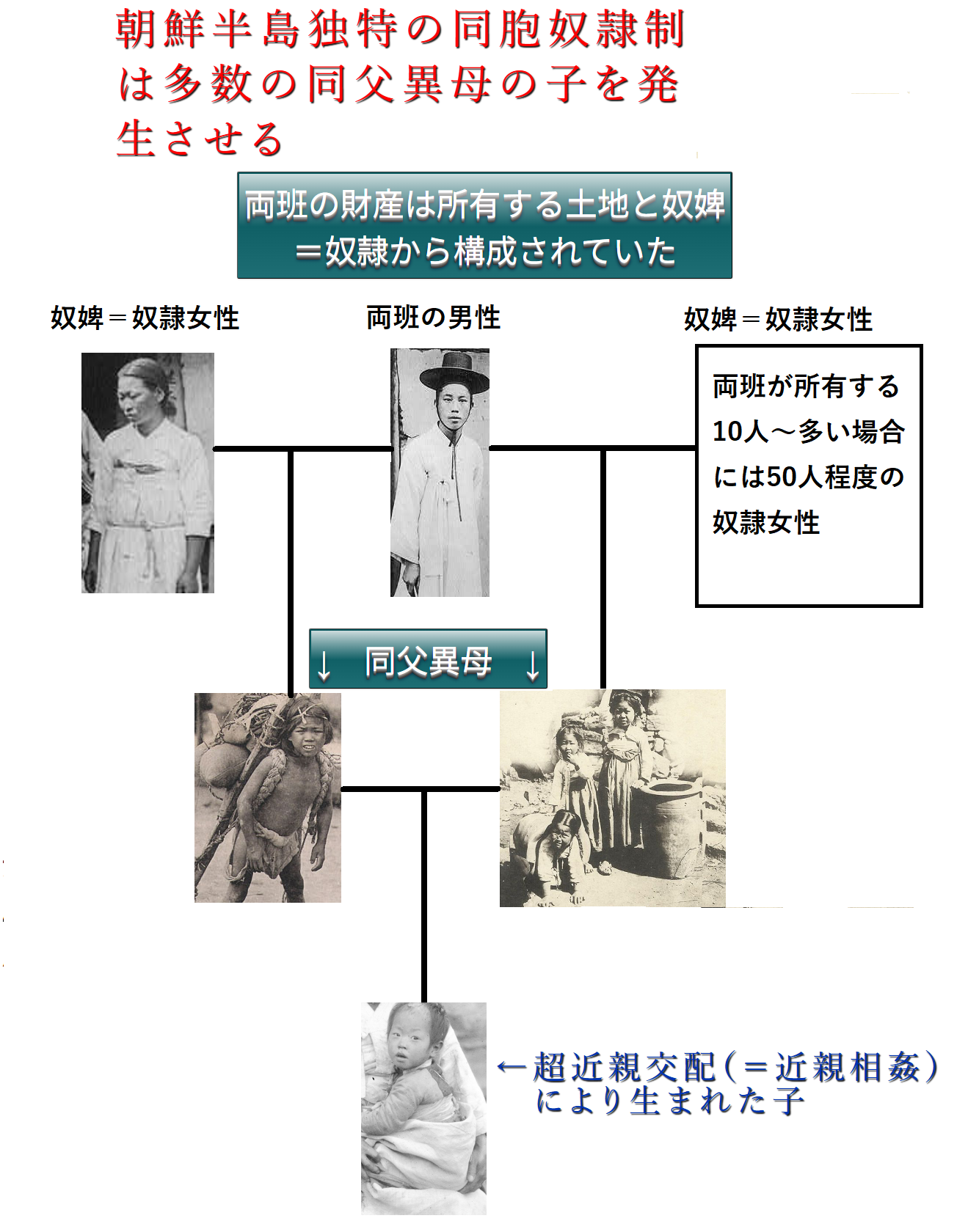 同父異母者間の交配は、通常の人類社会では非常に稀なケースなのですが、日韓併合前の朝鮮半島では「同胞奴婢制=同胞奴隷制」の故に、社会制度上、同父異母者間の超近親交配(=近親相姦)が不可避でした。なお、日韓併合(=日帝強占→韓国の表現)により朝鮮半島独特の奴隷制は完全に根絶されました。