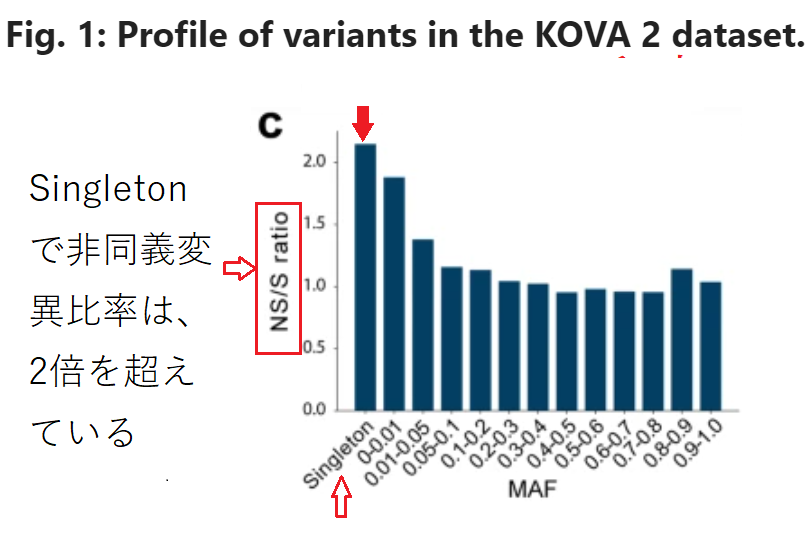 韓国人対象5,000名を超える大規模サンプル数の上記韓国人論文では、本文中で非同義変異が他民族集団に比べ高い比率 である旨を一切言及していない。しかし、非同義変異比率データが付属資料に記載され、本文中に下図が掲載されてている