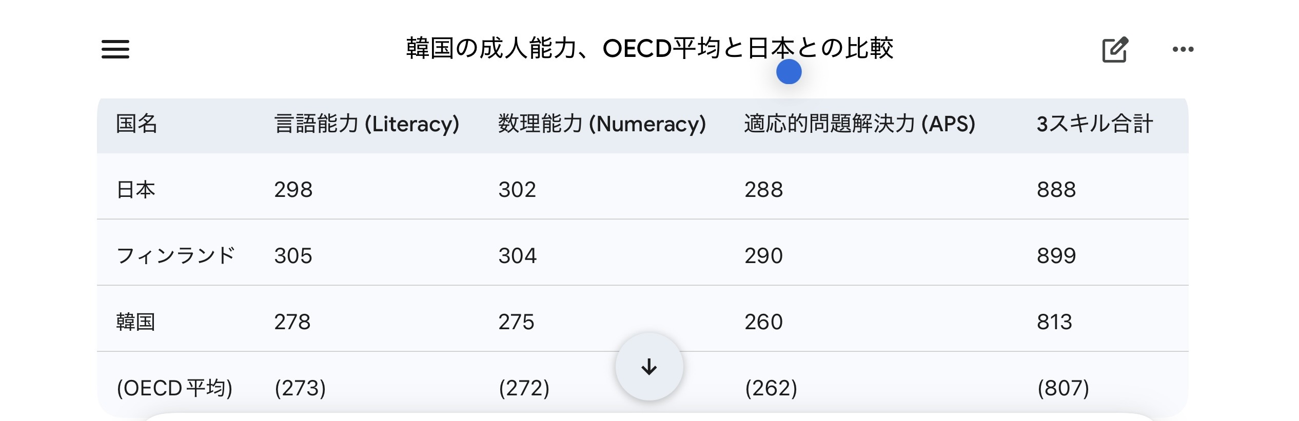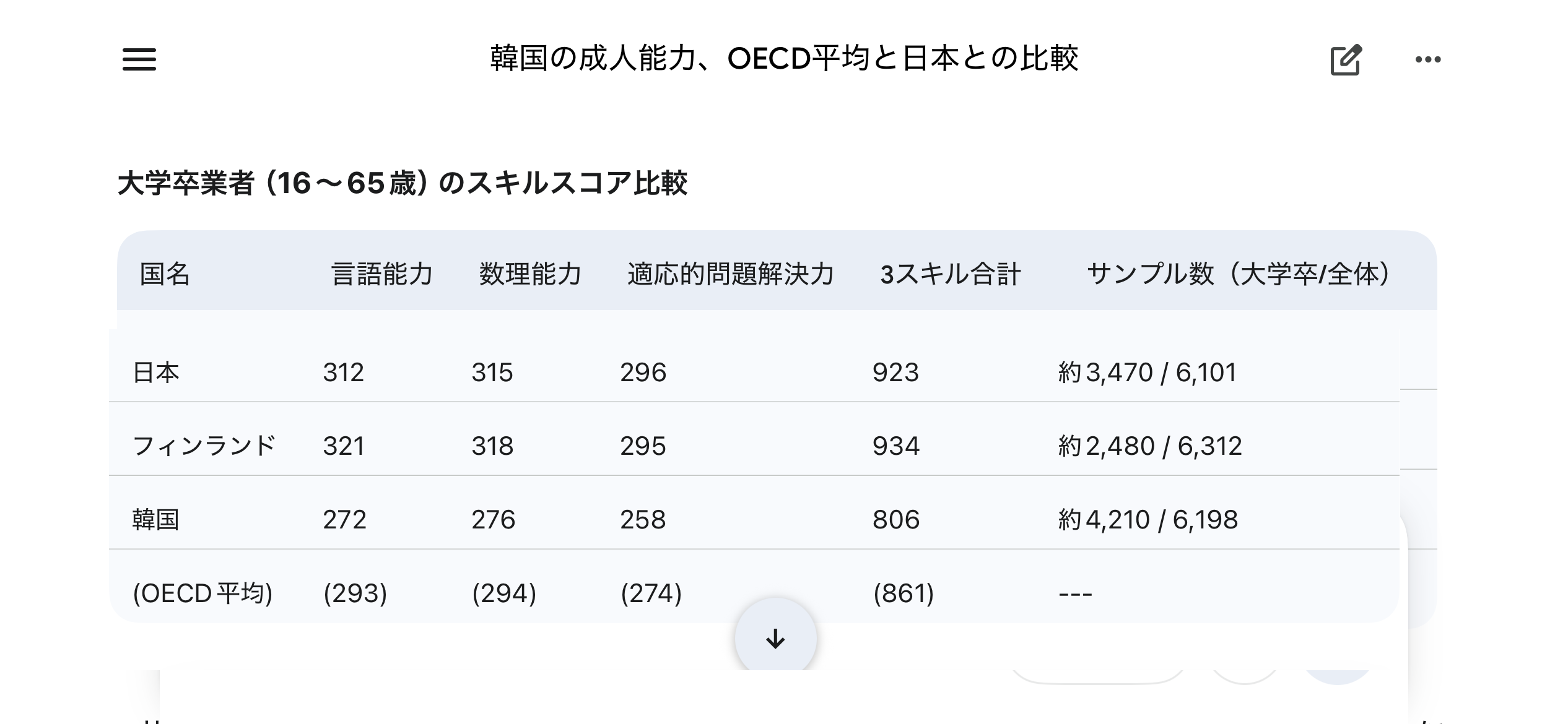 韓国は急速に近代化したため、現在の60代前後の層において、当時の教育機会の差(大学進学率の低さ)がスコアを押し下げている可能性があります(16-24歳の若年層ではOECD平均と同等である点が、これを裏付けています)。